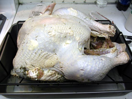 Now that you have a butter-massaged, stuffed turkey, you should tuck the wings under the shoulders (no need to actually truss unless they are really sticking out far) and position the bird breast-side up in a roasting pan. Roast it at 500 F for 30 minutes to brown the skin. After 30 minutes, flip it breast side down and drop the temperature to 350 F.* You'll keep it cooking until a thermometer inserted in the thickest part of the breast reads about 155 F. The temperature should go up to 160 F while resting. Don't overcook!