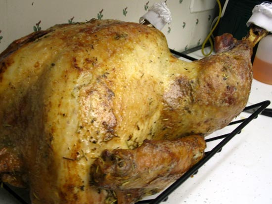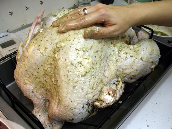 When it's time to cook, take the turkey out of the brine, rinse it off completely, pat it dry, and throw out the brine. Now it's time to butter up that bird. Whip some butter with the herbs of your choice -- rosemary, sage, and thyme will do nicely for a traditional flavor -- and insert lumps under the skin. Massage them in, then rub some butter around the outside of the bird as well. This will make for a photo-ready brown skin, and as the stuff gradually melts into the pan it becomes great gravy drippings.